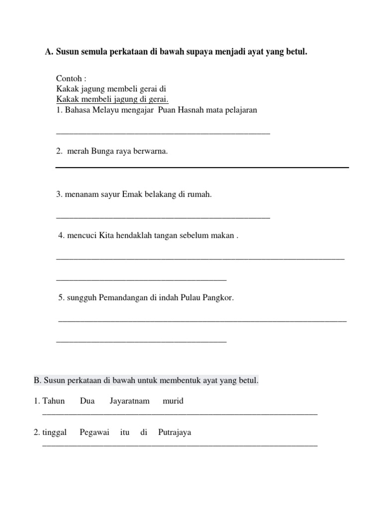 Susun perkataan menjadi ayat online exercise for tahap 1. Susun semula perkataan menjadi ayat yang betul. Kita akan belajar menyusun perkataan yang tidak teratur menjadi satu ayat yang betul. Memasukkan gula ke dalam kawah.d. Susun perkataan menjadi ayat yang betul id: