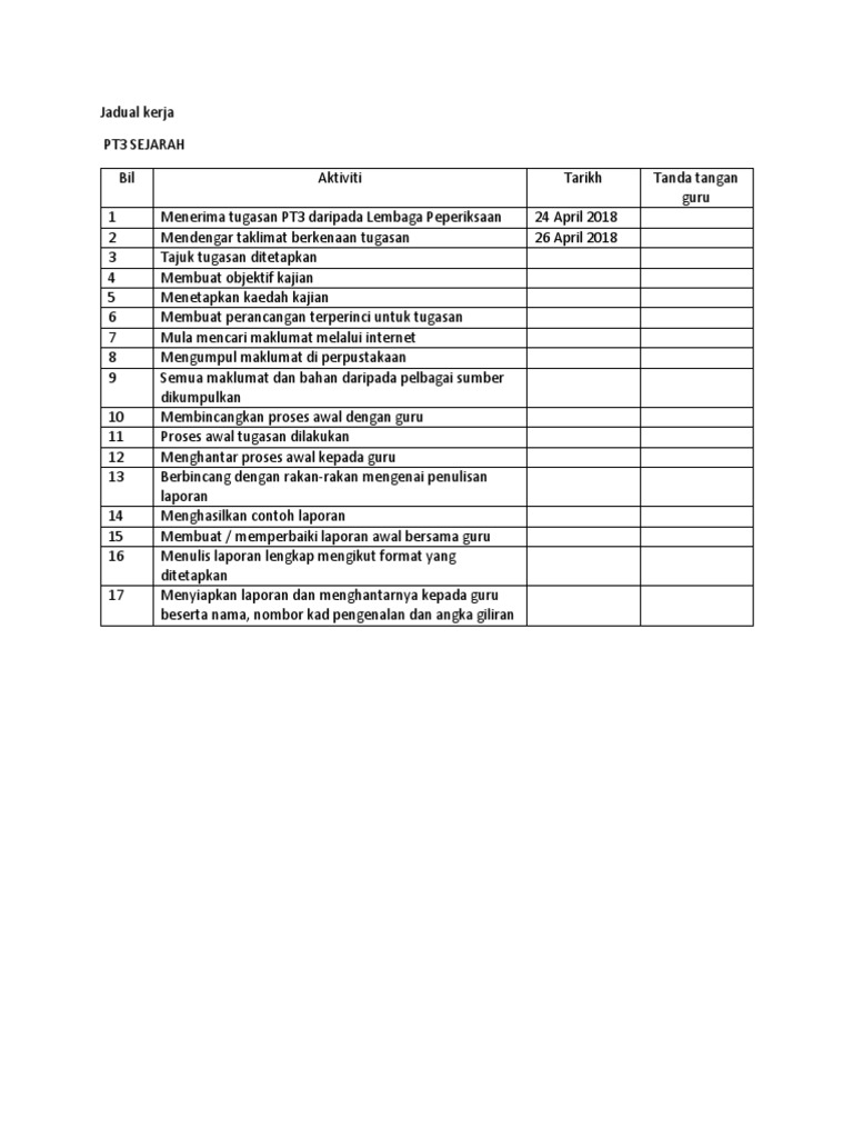 Jadual kerja pelaksanaan kajian kes (kerja kursus sejarah pt3 2019).