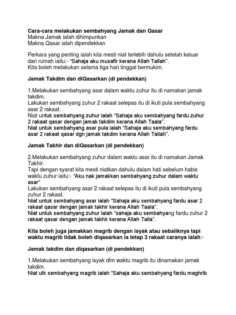 Hal itu juga lebih baik daripada shalat di rumah. Melalui qashar, dia diperkenankan meringkas rakaat salat yang empat empat rakaat menjadi dua rakaat. Jamak taqdim yaitu mengumpulkan dua shalat dan dikerjakan dalam satu waktu shalat yang pertama. Sekiranya mertua saya telah berpindah rumah kekampung lain adakah boleh solat jamak dan qasar? Jamak adalah keringanan shalat tidak pada waktunya.